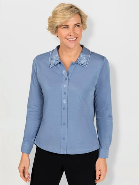 Chemisier jersey agréable. Broderie et petites pierres sur col chemise et patte de boutonnage. Pinces poitrine dès T. 44. Manchettes élégantes. Fentes latérales.