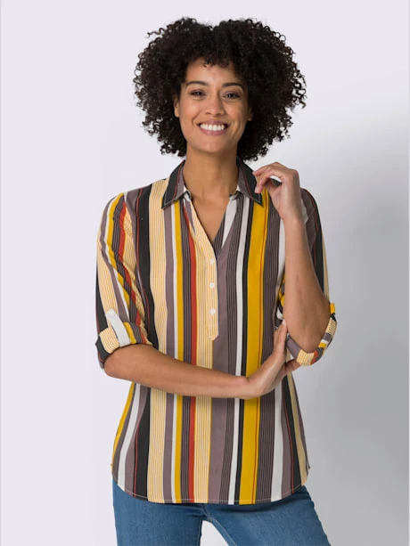 Chemisier à rayures en qualité crêpe facile d’entretien. Les rayures verticales affinent et subliment la silhouette. Facile à enfiler avec col chemise, V ouvert, patte de boutonnage courte et empiècement au dos. Les manches longues à manchettes boutonnées se transforment en manches 3/4. Ourlet légèrement arrondi.