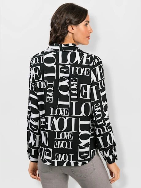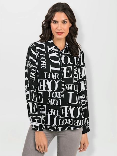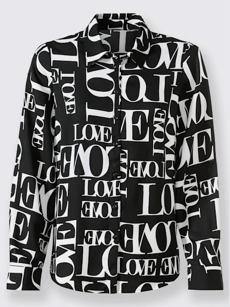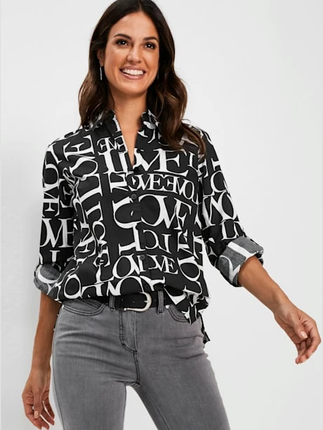 L’imprimé lettrage tendance fait tout le charme de ce chemisier. Col chemise, patte de boutonnage sur toute la longueur et ourlet arrondi. Les manches longues à manchettes boutonnées se transforment en manches 3/4. Polyester recyclé.