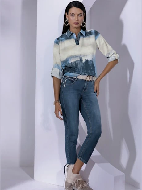 Pur plaisir ! Chemisier en fibre naturelle douce, imprimé placé. Col chemise et bordure en petites pierres brillantes fantaisie à l’encolure. Patte aux épaules avec pli au dos pour plus de largeur. Ourlet légèrement arrondi. Manches longues à manchette et fente transformables en manches 3/4 avec bouton et bride.