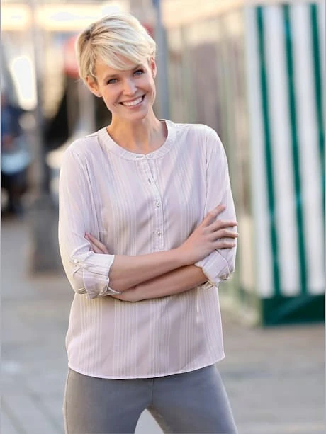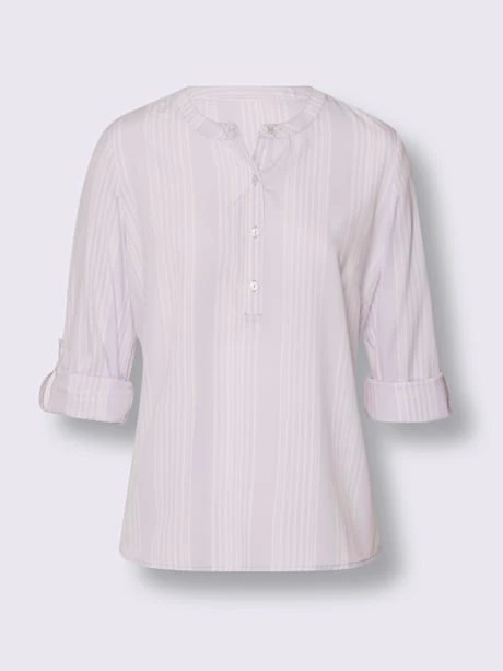 Chemisier rayé affinant facile à enfiler avec encolure ronde, patte de boutonnage courte et ourlet légèrement arrondi. Les manches longues à revers et fente se transforment en manches 3/4.