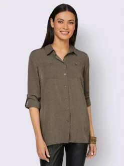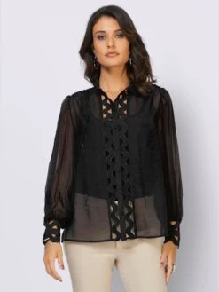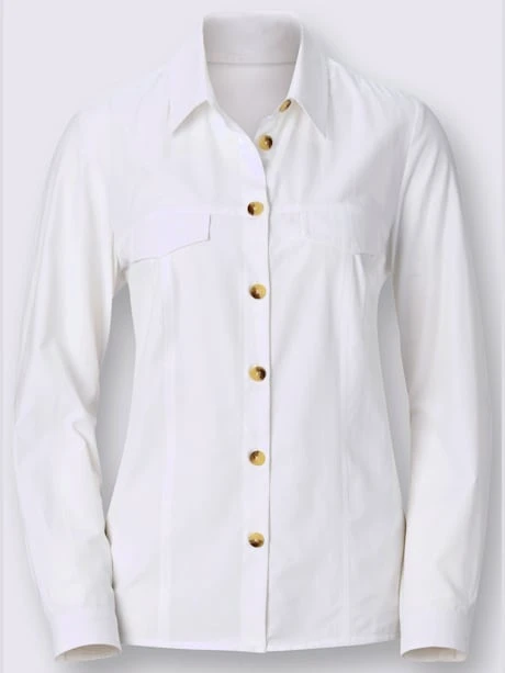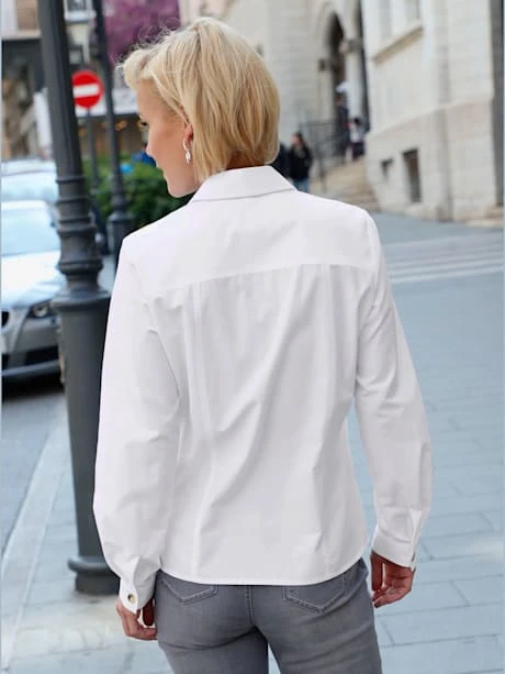 Incontournable : chemisier classique avec boutons contrastés. Col chemise et 2 rabats fantaisie. Empiècement au dos et coutures décoratives affinantes pour une coupe parfaite.