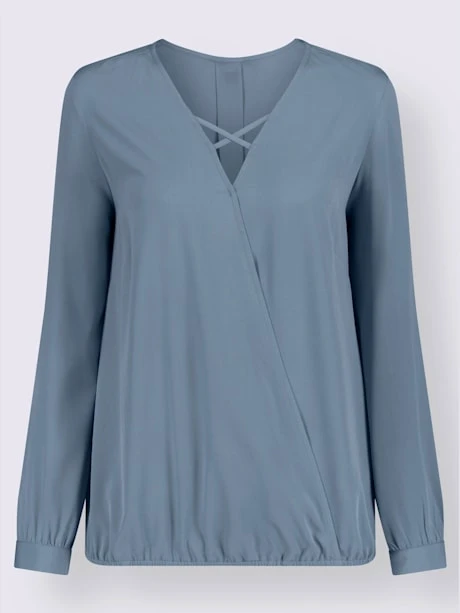 Grâce aux rubans croisés du col V, ce chemisier met joliment en valeur votre décolleté. Effet cache-cœur, largeur décontractée et base élastique pour une silhouette flattée. Manches longues avec bords-côtes légèrement froncés.