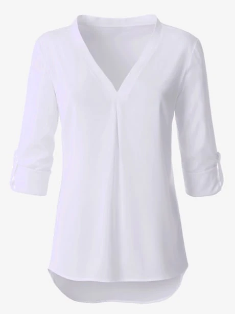 Chemisier long, toujours élégant ! Détails tendance : encolure en V, plis devant, manches longues retroussables et dos plus long.