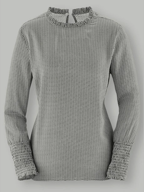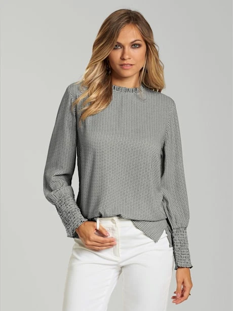 Super féminin : chemisier rehaussé d`une fronce fantaisie à l`encolure ronde et d`une bordure smockée à la finition des manches. Fermeture boutonnée fendue au dos. Ourlet droit et fentes sur les côtés.
