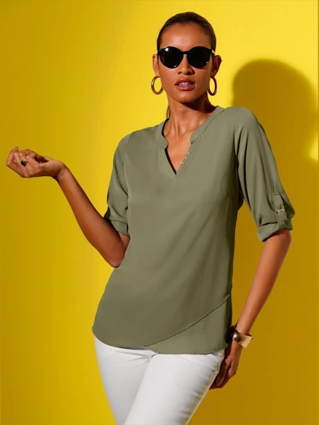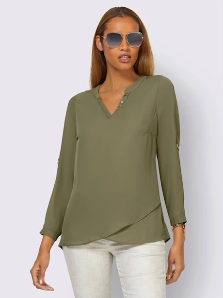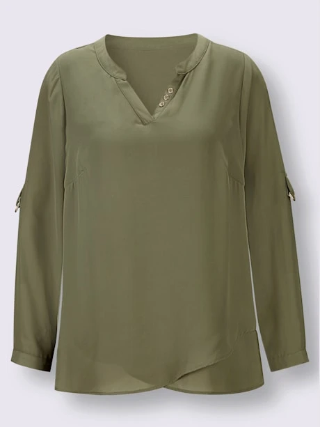Pour une silhouette sublimée : chemisier avec finition doublée devant. Encolure avec V ouvert ornée de boutons décoratifs. Ourlet asymétrique croisé pour un look exclusif. Manches longues avec bride et manchettes. Dos légèrement allongé et arrondi.