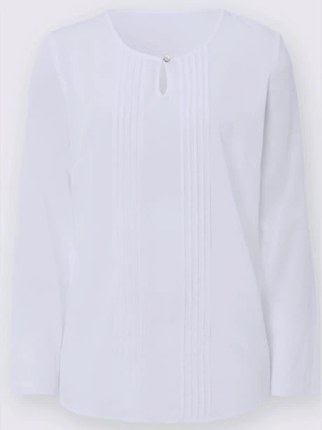 Chemisier classique facile à associer ! Facile à enfiler, encolure ronde avec petit V, fermeture par bride et bouton, nervures décoratives devant. Manches longues.