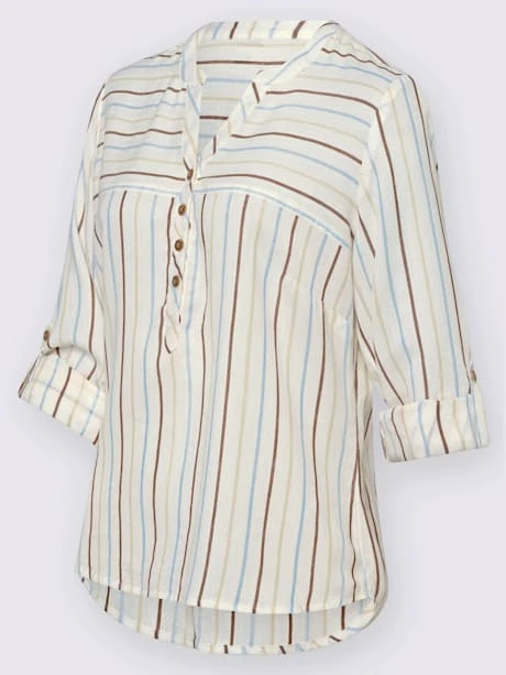 Superbe chemisier en flanelle rayée légèrement grattée. Coupe facile à enfiler avec encolure arrondie, petit V et patte de boutonnage courte avec boutons imitation bois. Pattes aux épaules rayées devant et au dos. Manches longues boutonnées retroussables en manches 3/4. Ourlet arrondi un peu plus long au dos.