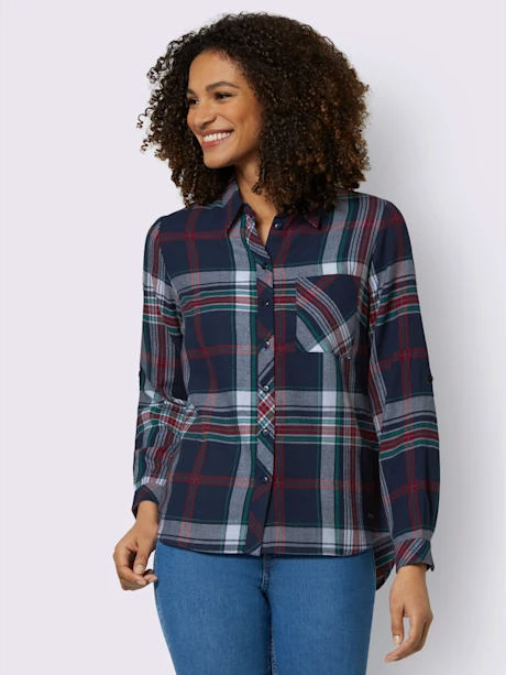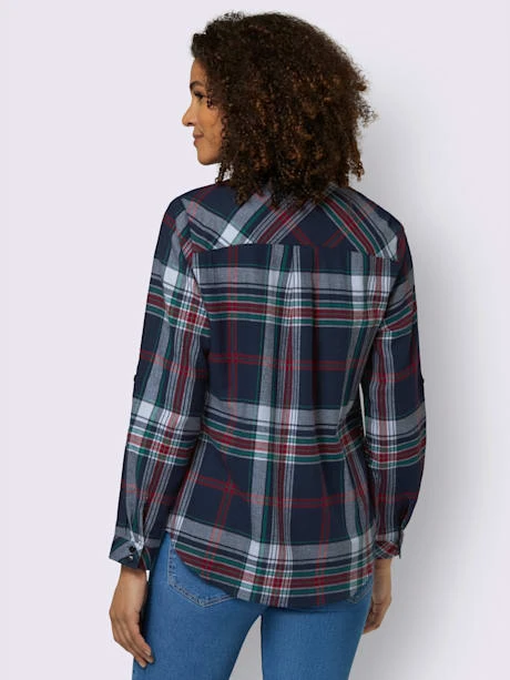 Chemisier en flanelle ultra-doux avec motif à carreaux typique. Col chemise, patte de boutonnage et pinces poitrine structurantes. Patte aux épaules et plis affinants au dos. Manches longues avec manchettes boutonnées, retroussables aux 3/4 avec bride et bouton. Poche poitrine plaquée, ourlet légèrement arrondi, un peu plus long au dos.