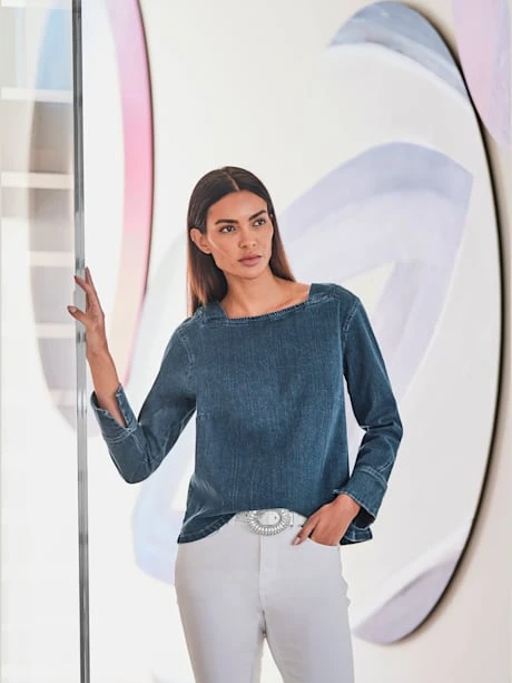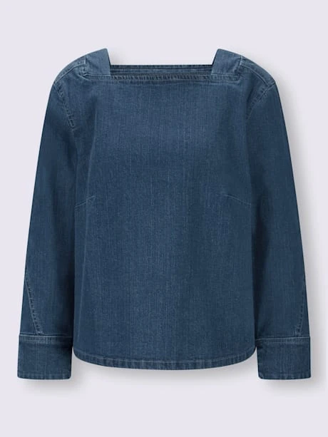 Chemisier en jean tendance avec encolure carrée tendance ! Manchettes fendues aux manches longues. Pinces poitrine tendance. Qualité douce. Soutient l’initiative Cotton made in Africa.