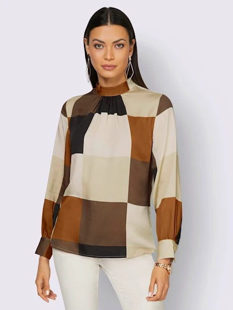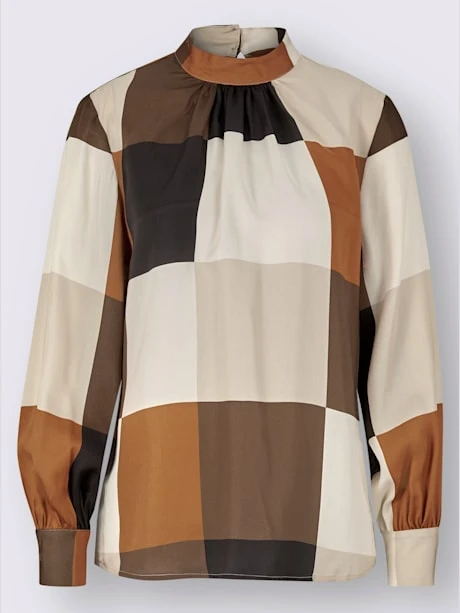 Ce chemisier extravagant séduit par son imprimé graphique placé à la brillance mate et soyeuse ! Qualité lyocell raffinée pour un toucher incroyablement doux. Col montant tendance avec fronces devant, fente et attache Brandebourg dans le cou. Pinces poitrine structurantes et manches longues avec manchettes boutonnées.