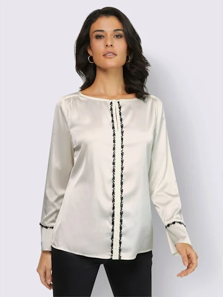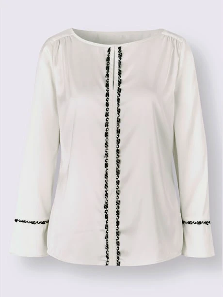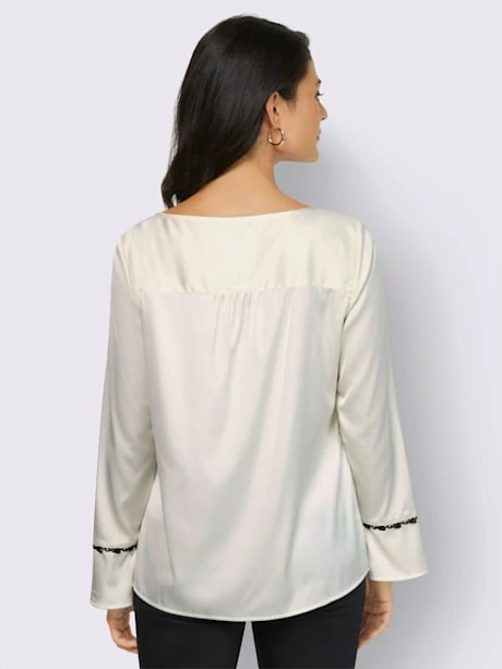 Magnifique dentelle : ce chemisier est magnifique avec ses détails délicats sur le devant et sur les manches. Encolure en U avec crochets et petite fente sur le devant, pinces poitrone et manches volant romantiques.