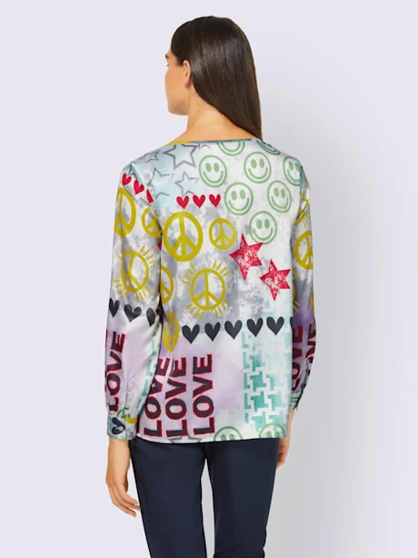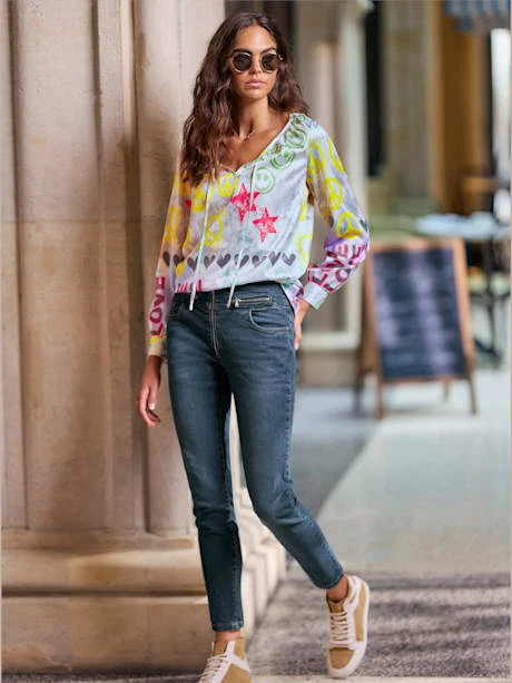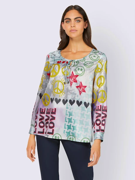 Chemisier imprimé tendance aux coloris actuels et au superbe imprimé. Lien à nouer à l’encolure ronde. Manches longues à manchettes boutonnées.