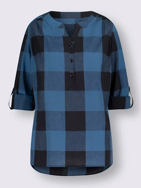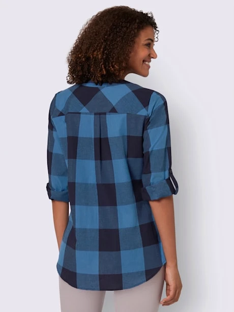 Chemisier long au fil tissé-teint haut de gamme avec bordure à l’encolure ronde, petit V ouvert et courte patte de boutonnage. Plis creux au dos pour un tombé décontracté. Les manches longues peuvent être retroussées et fixées avec une bride et un bouton. Base légèrement arrondie, un peu plus longue au dos que devant.