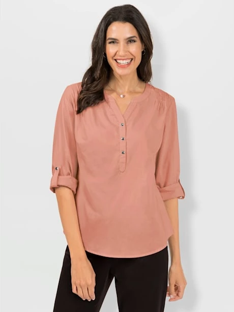 Ce chemisier facile à enfiler en coton léger et aéré promet un confort inégalé. Encolure ronde avec un petit V, courte patte de boutonnage et boutons argentés brillants. Couture de l’épaule avancée et empiècement au dos avec plis. Pinces poitrine. Les manches longues à manchettes boutonnées peuvent être retroussées à la longueur 3/4 et fixées par des brides boutonnées. Base arrondie et fentes côtés. En achetant ce vêtement, vous soutenez l’initiative « Cotton made in Africa ».