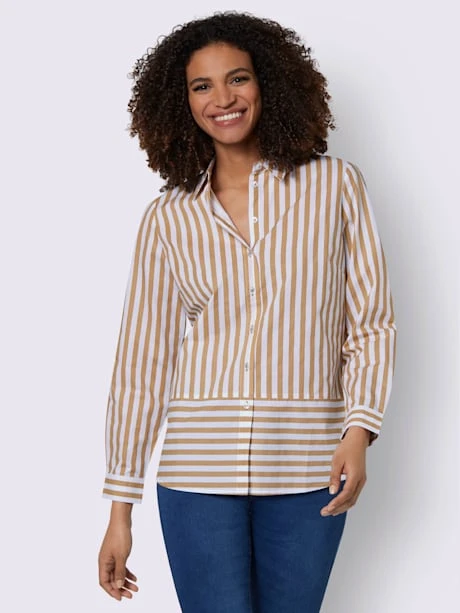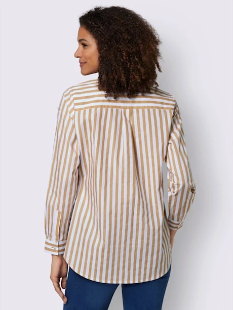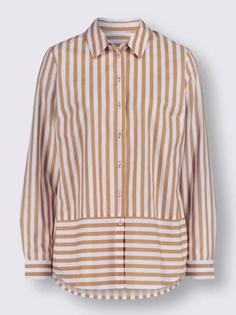 Chemisier long associant rayures verticales et horizontales. Col chemise, pinces poitrine et patte de boutonnage. Empiècement aux épaules et plis pour plus de largeur au dos, tombé flatteur et affinant la silhouette grâce à l’ourlet légèrement arrondi et plus long au dos. Manches longues avec manchettes boutonnées. Qualité batiste raffinée.