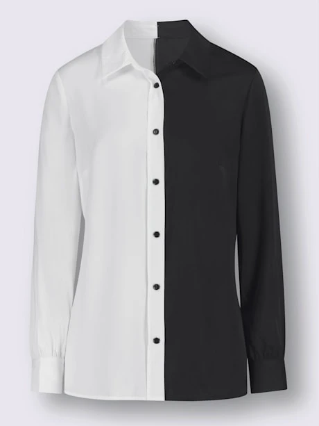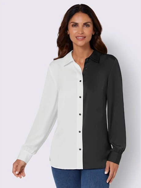 Jouez sur les contrastes saisissants ! Chemisier ultra-doux Ă l’aspect blocs de couleurs tendance, 2 cĂ´tĂ©s de couleurs diffĂ©rentes. Col chemise, patte de boutonnage, manchettes boutonnĂ©es aux manches. Fentes latĂ©rales facilitant les mouvements.