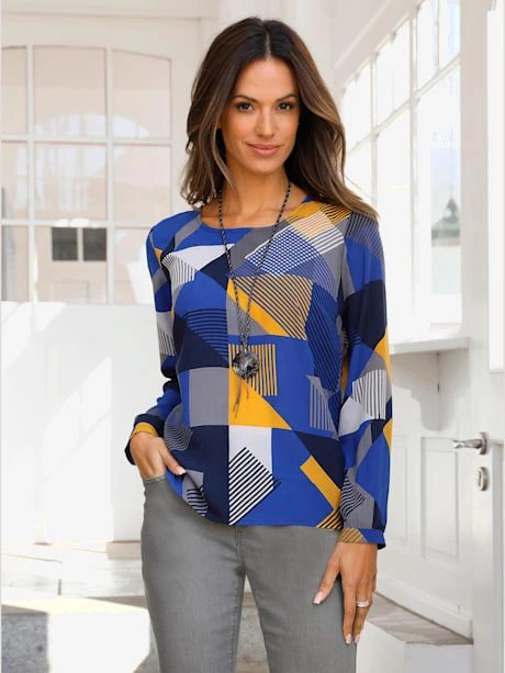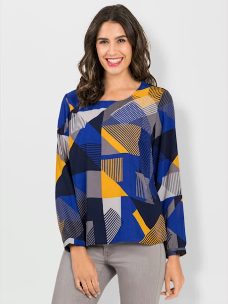 Les motifs sont à l’honneur ! Chemisier au motif graphique multicolore, facile à enfiler. Encolure ronde et pinces poitrine structurantes. Fente avec boucle et bouton dans le cou pour faciliter l’enfilage. Manches longues à fines manchettes boutonnées.