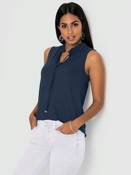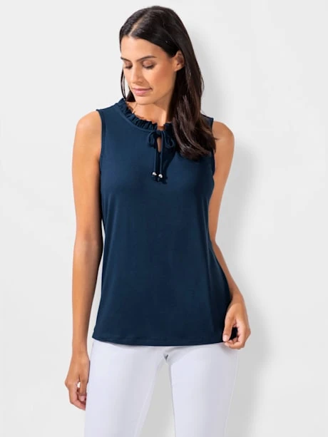 Ce débardeur doit son allure féminine à son col montant froncé tendance avec lien à nouer et fente. Sa qualité fluide offre un tombé ample et dissimule habilement les petites rondeurs.