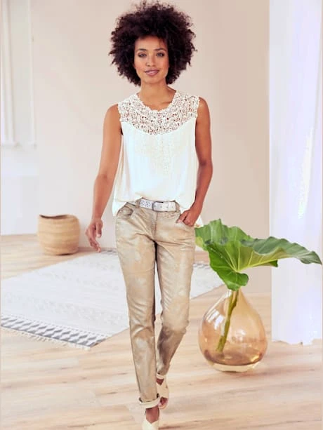 Débardeur en dentelle à effet plissé. Empiècement en dentelle, partiellement transparent, doublure en jersey.