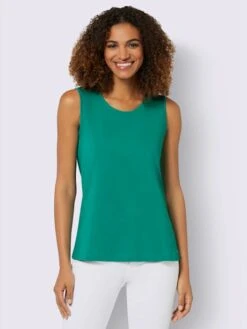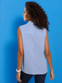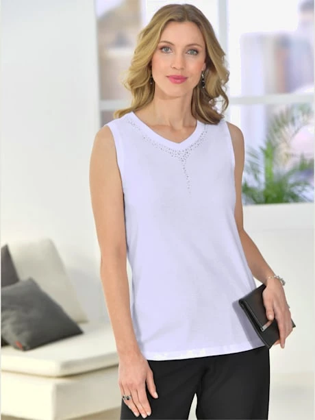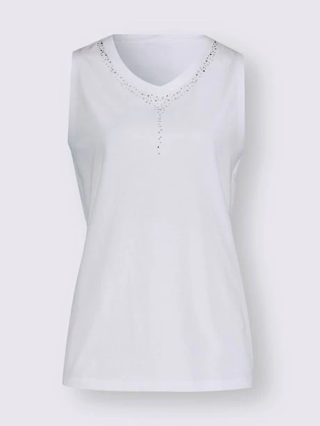 Débardeur orné de ravissantes petites pierres fantaisie sur le décolleté, pas besoin de collier. Encolure en V légèrement arrondie.