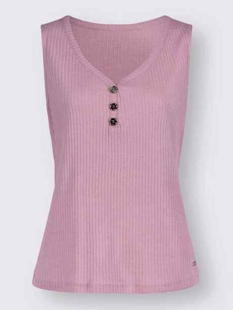 Ce débardeur doit son confort à sa qualité côtelée et extensible. Encolure en V en forme de cœur et patte de boutonnage décorative.