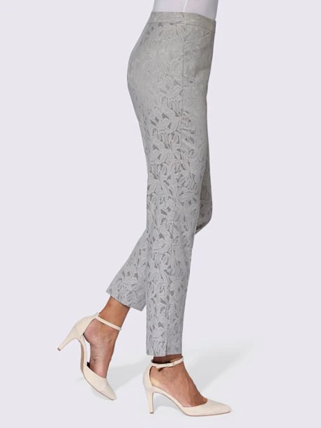 Dans un motif jacquard de feuilles raffiné : pantalon élégant avec plis devant et dos. Coupe étroite et légèrement raccourcie avec fentes au bas de jambes. Taille confortable avec agrafe et fermeture à glissière en nylon devant et bouton de sécurité à l’intérieur. 2 poches biais. En achetant ce vêtement, vous soutenez l’initiative « Cotton made in Africa ». Largeur bas env. 36 cm.
