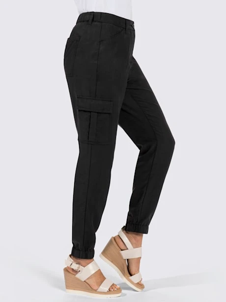 Pantalon décontracté et agréable à porter, ceinture élastique à l’arrière, passants, glissière et bouton devant. 2 poches devant et 2 poches à rabat plaquées sur la couture latérale avancée. Bords-côtes extensibles tendance. Largeur pieds env. 30 cm. Livré sans la ceinture.
