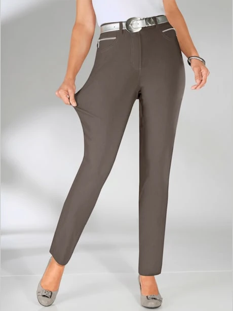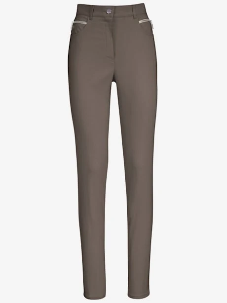 Coupe parfaite et indéformable offrant une grande liberté de mouvement. Pantalon en qualité extensible avec fermeture à glissière et bouton, passants. 2 poches arrondies et 2 fausses poches avec zip fantaisie. Ceinture intégrée à passants.