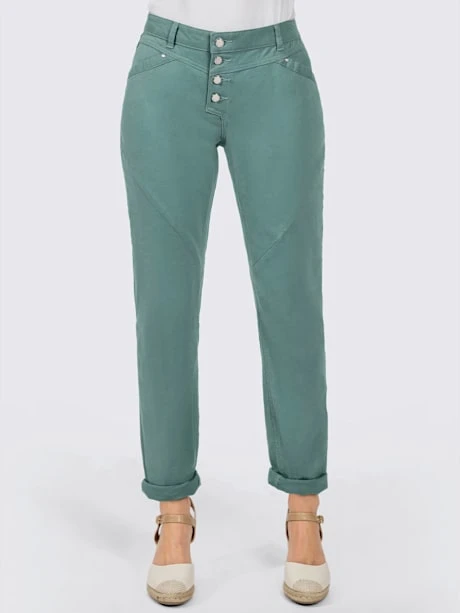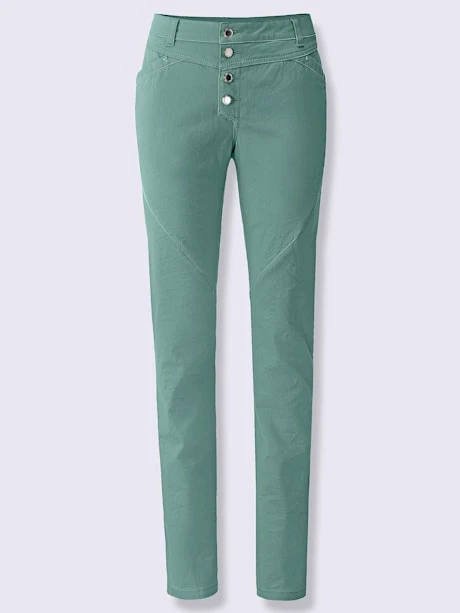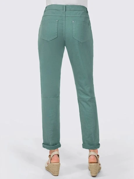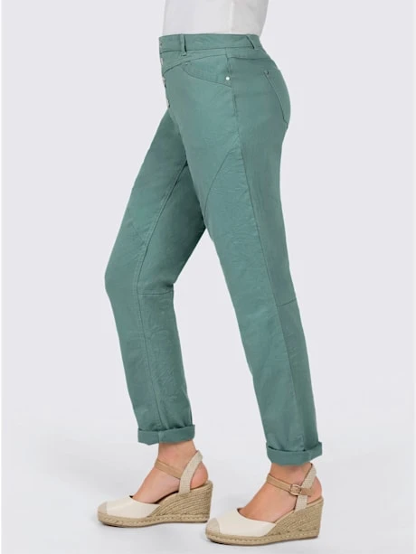 Ce pantalon twill est non seulement très doux au toucher, mais très facile à entretenir grâce à son aspect légèrement froissé : repassage superflu. Ceinture gainante avec passants, fermeture à glissière courte et 4 boutons fantaisie devant. Empiècement devant et au dos. 2 poches devant et 2 poches arrière plaquées. Coutures de séparation diagonales devant. Largeur pieds env. 38 cm. Livré sans la ceinture.