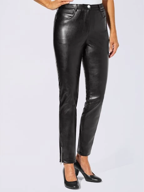 Très facile à assortir : Pantalon en matière synthétique tendance, doux, agréable et facile à entretenir. Ceinture à passants, glissière et bouton devant. 2 poches devant et 2 poches plaquées arrière. Superbes glissières pratiques au bas des jambes. Largeur pieds env. 30 cm.