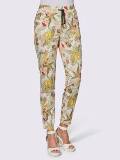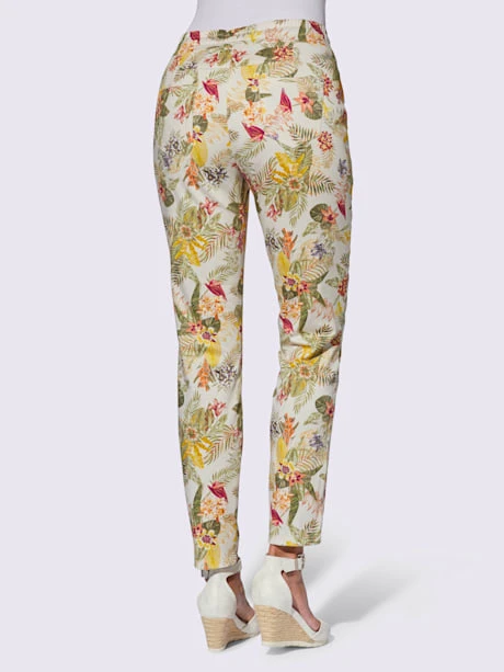 Pantalon à l’imprimé floral tropical. Ceinture élastique avec coulisse et lien à nouer devant. 2 poches latérales et 2 poches arrière plaquées. Indéformable.
