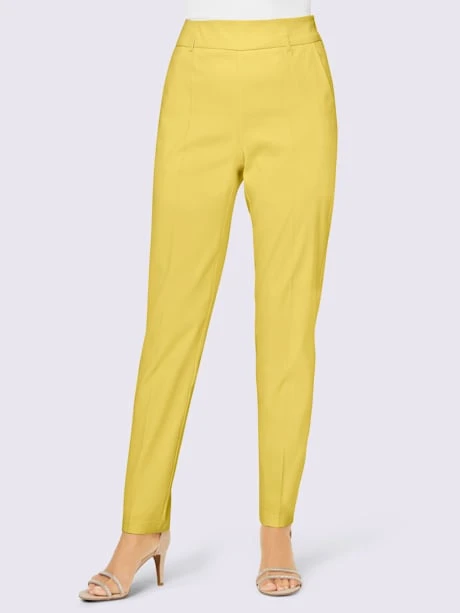 Pantalon tendance avec ceinture haute gainante. Glissière et bouton intégrés dans la couture latérale ! Plis repassés affinants devant et au dos. 2 poches latérales. Largeur pieds env. 34 cm. Livré sans la ceinture.