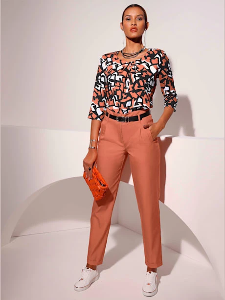Pantalon très agréable à porter grâce au pourcentage élevé de lyocell. Cette qualité est connue pour être douce comme la soie et fraîche comme le lin. Coupe paperbag tendance : taille haute, passants, crochets, œillets, glissière et 2 poches devant. 2 fausses poches au dos. Ourlet à revers fixe. Largeur pieds env. 32 cm. Livré sans la ceinture.