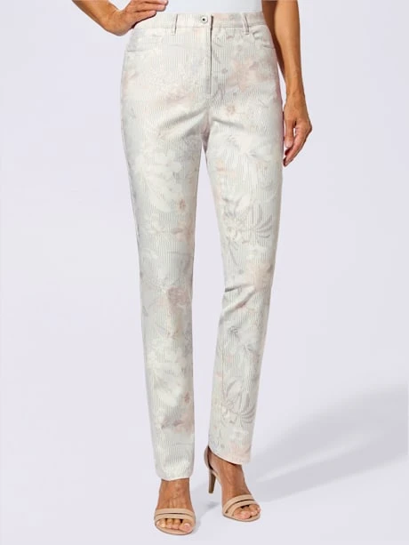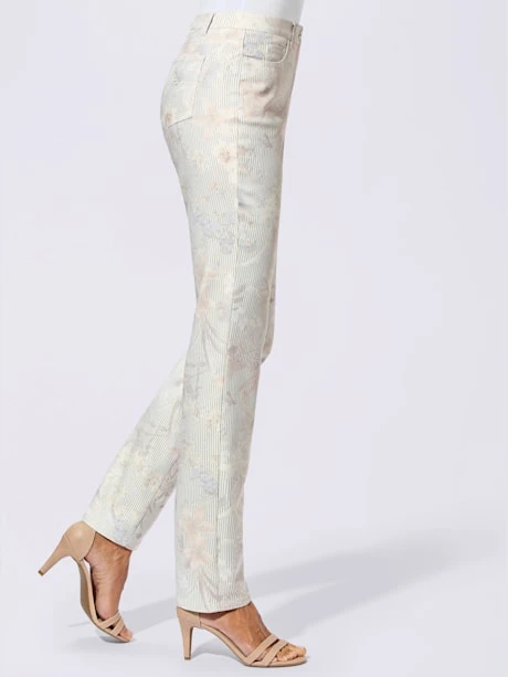 Élégant pantalon signé Cosma à imprimé floral. Coupe classique 5 poches, glissière et boutons, passants. Empiècement au dos pour une coupe élégante et une tenue parfaite. Largeur pieds 36 cm.