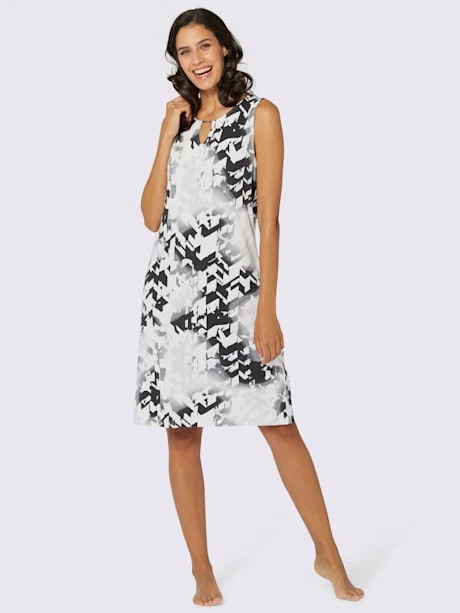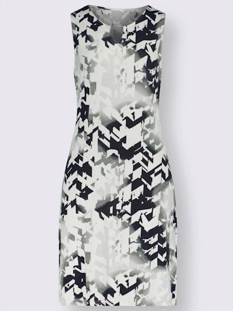 Tout en légèreté : Robe d`été au motif graphique, boucle fantaisie couleur argent à l`encolure en V.