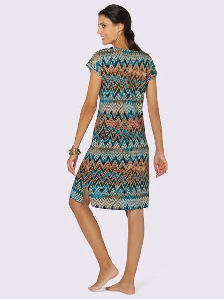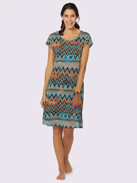 Robe d`été au superbe motif zigzag. Encolure ronde, mancherons et fentes latérales. Jersey fin.