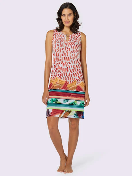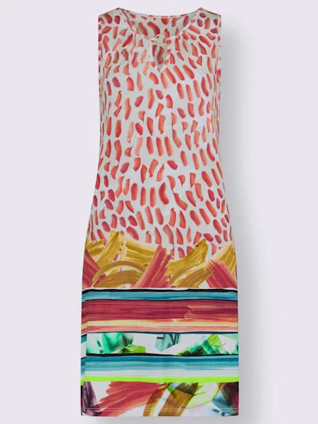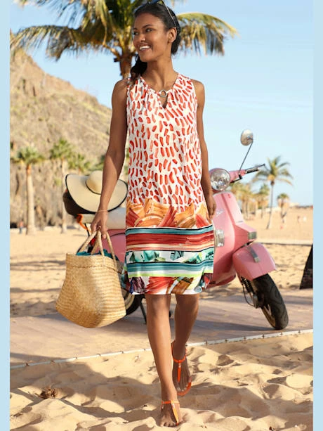 Robe d`été tendance pour la plage ou la piscine extérieure ! Encolure ronde, découpe goutte d`eau et anneau fantaisie. Association de motifs tendance et qualité jersey fin ultra-douce.