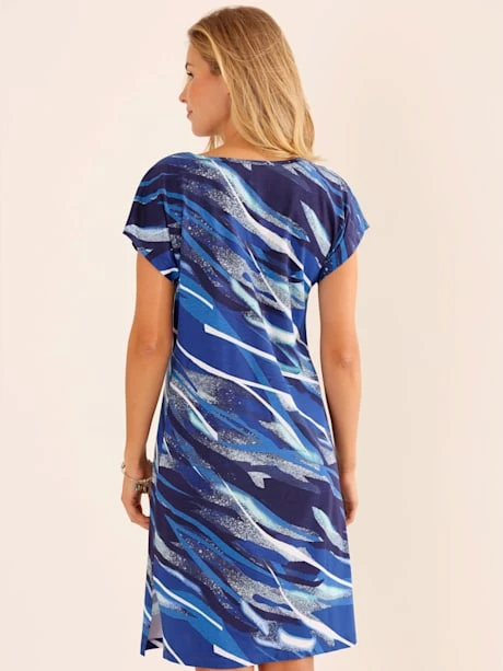 Robe d`été confortable au joli motif imprimé. Encolure ronde, mancherons et fente latérale pour faciliter les mouvements. Jersey fin.