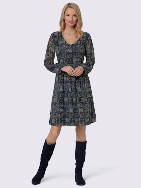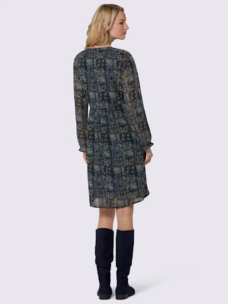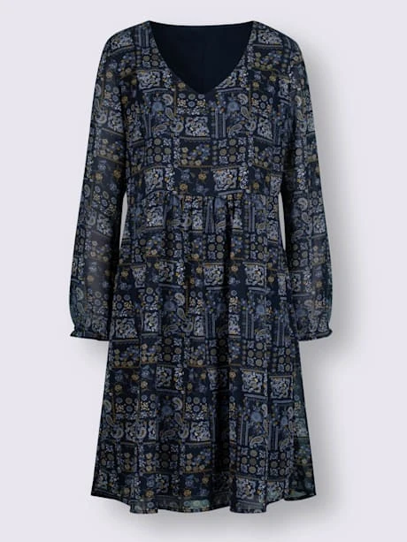 Robe tendance au motif patchwork tendance et qualité crêpe fluide. Doublure opaque devant et au dos, manches légèrement transparentes. Nombreux détails affinants : encolure en V profonde. Manches longues à l’effet décontracté grâce aux finitions smockées dissimulant le haut des bras. Partie jupe froncée au niveau de la couture de séparation pour donner de l’ampleur et dissimuler les petites rondeurs au niveau des fesses, des hanches et des cuisses.