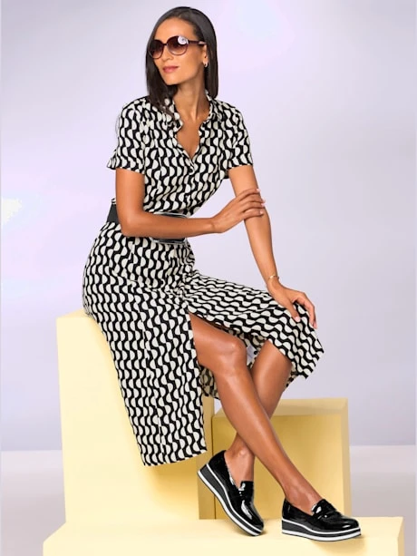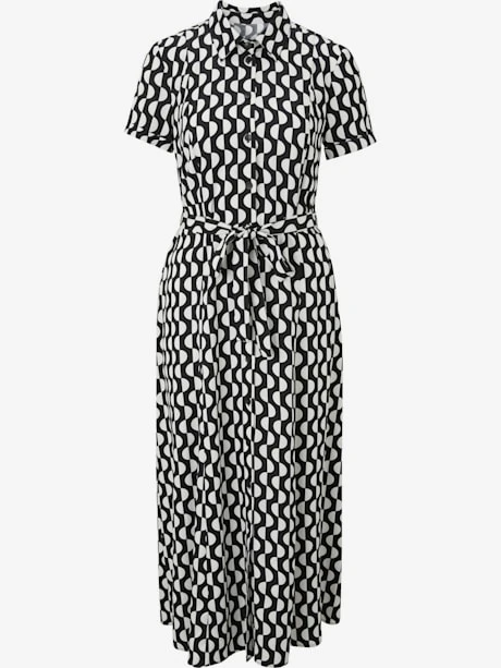 Robe-chemisier ornée d’un motif imprimé moderne. Coupe ample flatteuse, patte de boutonnage sur toute la longueur, manches courtes. Ceinture à nouer assortie incluse.