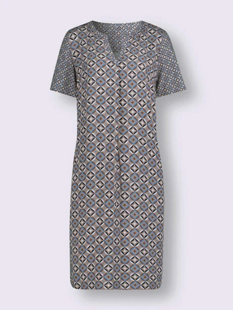Robe tunique associant un grand motif imprimĂ© devant et au dos Ă un petit motif au niveau des manches, de l’empiècement au dos ainsi que de la bordure de l’encolure ronde avec petit V. Pli devant et plis au dos pour une coupe ample. Manches flatteuses dissimulant les bras. 2 poches cousues pratiques sur les cĂ´tĂ©s. QualitĂ© tissĂ©e.