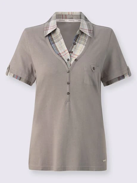 T-shirt aspect 2 en 1 décontracté grâce à l’empiècement à carreaux tissé avec col chemise à l’encolure et aux manches courtes avec bride et bouton. Jolie patte de boutonnage décorative à l’encolure en V et poche poitrine plaquée boutonnée.