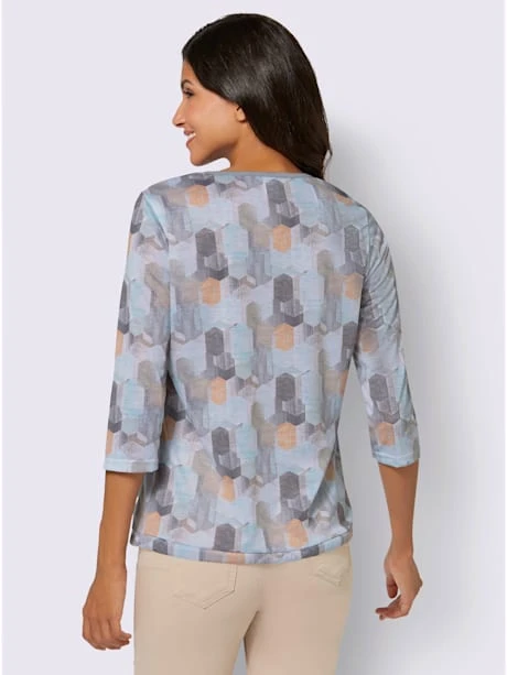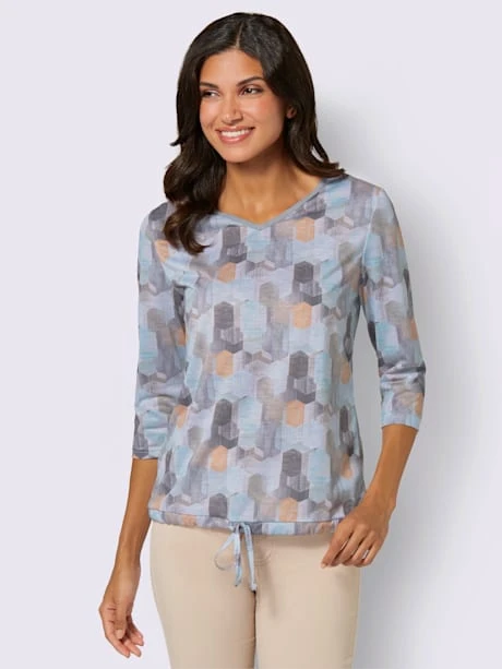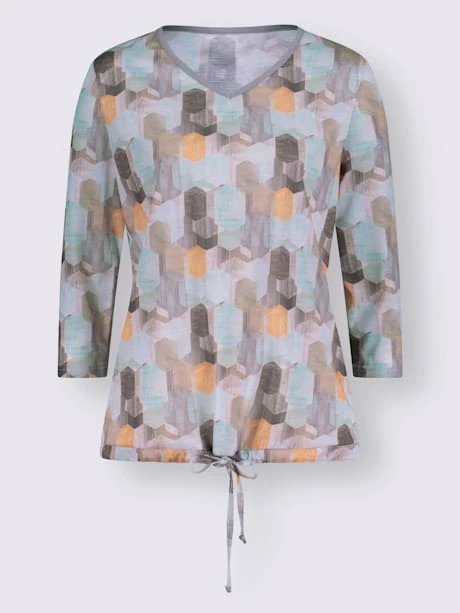 Les motifs sont des merveilles faciles à assortir ! T-shirt imprimé intégral avec encolure en V, manches 3/4 et coulisse avec lien à nouer à l’ourlet.