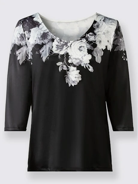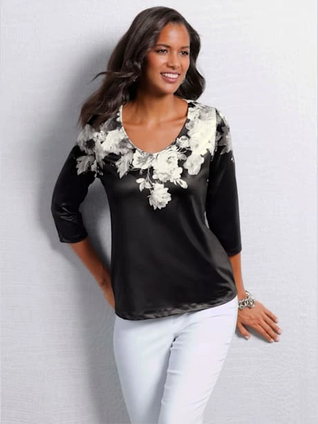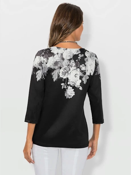 Ravissant t-shirt au superbe motif floral devant et au dos. Encolure en V élargie et manches 3/4. Entretien facile.
