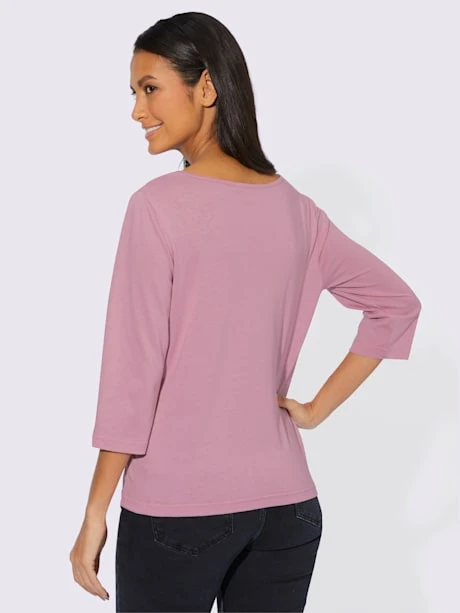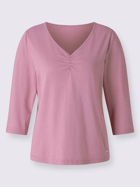 T-shirt facile à associer avec fronces sous l’encolure en V. Manches 3/4. Qualité jersey fin souple.