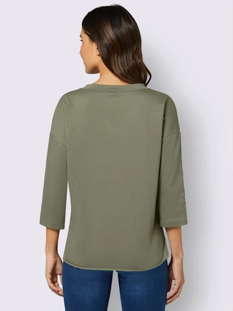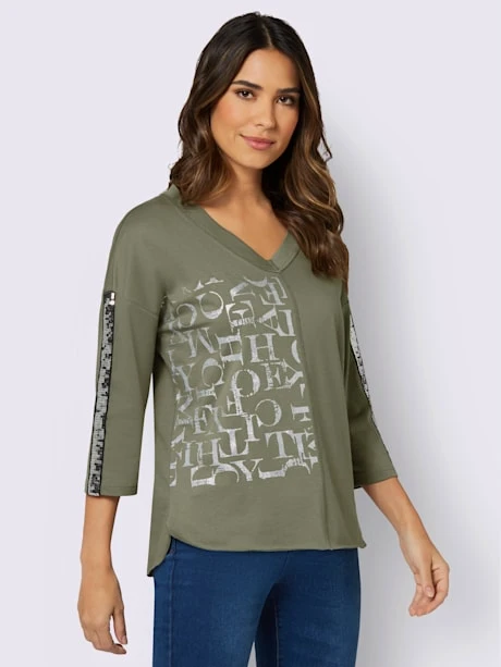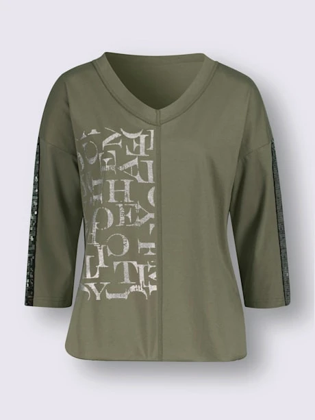 T-shirt orné de lettres et d’un imprimé feuille brillant sur le devant, ainsi que de rubans à paillettes le long des manches 3/4.