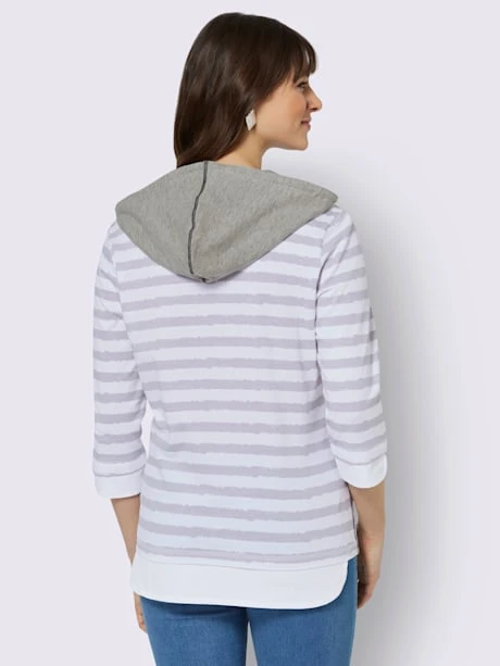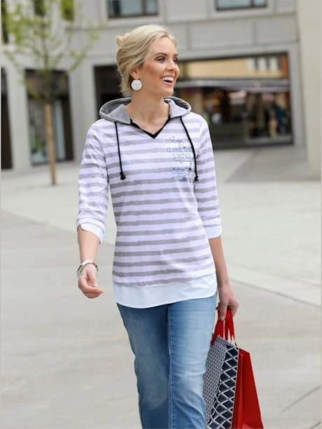Avec ce T-shirt, de nouvelles rangées de rayures investissent votre garde-robe. Imprimé devant et empiècements tissés contrastés sur les manches 3/4 et à l’ourlet. Capuche, encolure en V et fentes sur les côtés.