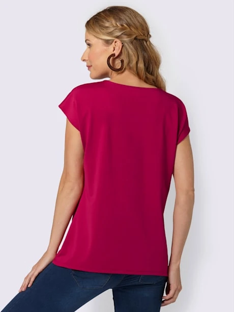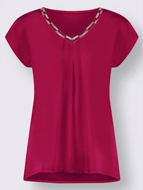 Waouh ! Ce T-shirt attire tous les regards avec sa bordure colorée ornée de perles fantaisie sur l`encolure en V. Plis flatteurs devant. Mancherons décontractés.