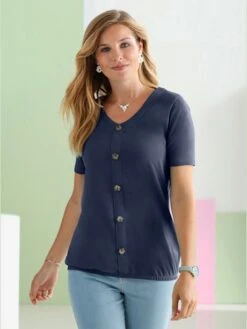 Coloré pour la nouvelle saison ! T-shirt avec encolure en V arrondie, patte de boutonnage sur toute la longueur avec gros boutons aspect bois et ourlet avec bande élastique. T-shirt au tombé fluide dissimulant les rondeurs au niveau du ventre et de la taille.